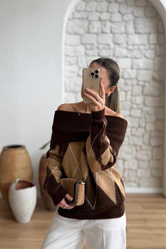 Sıcak kahve tonları, zamansız baklava deseni ve zarif degaje yaka detayıyla hem klasik hem modern bir stil sunan bu kazak, günlük kombinlerinize sofistike bir hava katar.
