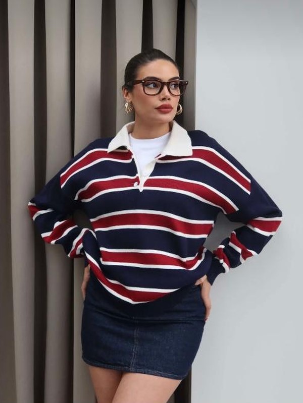 Klasik polo yaka detayı ve asil lacivert tonu ile zamansız şıklığı modern bir dokunuşla buluşturan bu kazak, hem günlük kombinlerinizde hem de ofis stilinizde rahatlıkla tercih edebileceğiniz kurtarıcı bir parçadır.